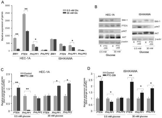 Glucose-dependent effect of BMI-1 inhibition in endometrial cancer cells. (A) The mRNA expression level of BMI-1, PTEN, PHLPP1, and PHLPP2 in HEC-1A and Ishikawa cells grown in hypo- and hyperglycemia conditions. The effect of PTC-209 on BMI-1and PTEN protein–protein levels and AKT phosphorylation level (Ser473) (B) as well as PTEN and PHLPP1/2 in HEC-1A (C) and Ishikawa (D) cells growing in low or high glucose concentrations. The figure shows the means ± SD for three experiments performed in triplicate. The asterisks indicate values of expression that were significantly different in cells treated with PTC-209 compared to control cells; * p values of <0.05; and ** p values of <0.01. The whole wester blots are showed in File S1.