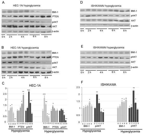 Effect of insulin stimulation on BMI-1, PTEN, and AKT phosphorylation levels (Ser473) in HEC-1A (A,B) and Ishikawa (D,E) in low and high glucose concentration. The results from two independent repetitions of insulin treatment for 2, 4, 6, and 8 h are shown in each blot. The intensity of bands corresponding to proteins after Western blot was analyzed by densitometry. The results are shown as the fold change of proteins level after 2, 4, 6, and 8 h of insulin stimulation vs. control (unstimulated cells) in HEC-1A (C) and Ishikawa (F) cells. The figures show the means ± SD for three experiments performed in triplicate. The asterisks indicate values of expression that were significantly different in cells treated with PTC-209 compared to control cells; * p values of <0.05; ** p values of <0.01, and *** p values < 0.001. The whole wester blots are showed in File S1.