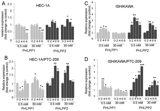 Effect of insulin stimulation on expression of PTEN, PHLPP1, and PHLPP2. HEC-1A (A,B) and Ishikawa (C,D) cells were treated with insulin for 0, 2, 4, 6, and 8 h in hypo- or hyperglycemia conditions in the absence (A,C) or presence (B,D) of PTC-209 pretreatment. The figure shows the means ±SD for two experiments performed in triplicate. The asterisks indicate values of expression that were significantly different in cells treated with PTC-209 compared to control cells; * p values of <0.05; ** p values of <0.01, and *** p values < 0.001.
