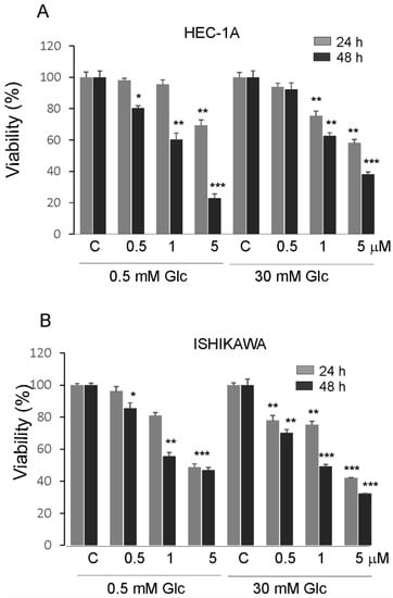 HEC-1 and Ishikawa cell lines were treated with 0.5, 1, or 5 µM PTC-209 (MedChem Express, Monmouth Junction, NJ, USA) under different conditions. The endometrial cancer cells were treated with PTC-209 in standard culture conditions or low (0.5 mM) or high (30 mM) glucose concentrations. The effect of the treatment was checked after 48 h. Additionally, the cells grown in low or high glucose after 24 h of serum starvation were stimulated with 100 nM insulin (Sigma Aldrich, St. Louis, MO, USA) and were harvested after 2, 4, 6, and 8 h.