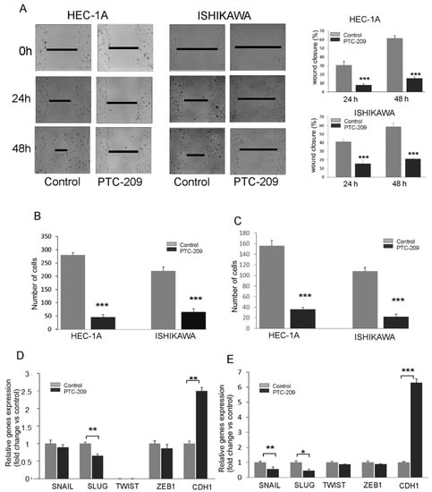The effect of the PTC-209 inhibitor on the migration capacity of endometrial cancer cells using a wound-healing assay and Transwell assay. After the injury of the tipping scratch, the HEC-1A and Ishikawa cells were treated with PTC-209. The cell migration ability was estimated based on a measure of distance between the wound edges after 0, 24, and 48 h. We observed a significantly reduced migratory potential of cells treated with PTC-209 compared to the control (Figure 6A). Similar results were also detected in the Transwell assay for both cell lines (Figure 6B). The invasion ability was estimated using Transwell assay with Matrigel. The results showed decreased invasion ability of HEC-1A and Ishikawa cells after PTC-209 treatment (Figure 6C). To evaluate the effect of BMI-1 inhibition on epithelial to mesenchymal transition, we examined the expression of several genes involved in these processes such as SNAIL, SLUG, ZEB1, TWIST, and CDH1. The results demonstrated that PTC-209 treatment was associated with a decreased transcript level of SLUG in HEC-1A cells (Figure 6D) and decreased transcript level of SLUG and SNAIL in Ishikawa cells (Figure 6E). In both cell types, the expression of CDH1 was significantly increased in both cell types (Figure 6D,E). These results suggest that BMI-1 inhibition by PTC-209 might impact genes involved in epithelial to mesenchymal transition in endometrial cancer cells and, by that, affect the cell migration and invasion ability of endometrial cells.