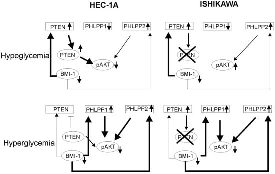 The mechanisms of hyperglycemia and insulin resistance that impact cancer onset and progression are not completely understood. Duan et al. (2019) showed that BMI-1 expression is increased in high glucose concentrations in pancreas cancer cells PANC-1 and SWI1990 []. In endometrial cancer cells, the BMI1 transcript level was higher in high glucose concentration but the Bmi-1 protein level was higher in low glucose compared to high glucose. These results suggest that there may be post-transcriptional regulation of the BMI-1 level by a glucose-dependent mechanism. The glucose concentration also affected PTEN and PHLPP1. The effect of BMI-1 inhibition in HEC-1A cells on PTEN and PHLPPs was different in hypoglycemia and hyperglycemia. It seems that in low glucose the lower phosphorylation of AKT seems to be dependent on PTEN while in high glucose more is on PHLPPs expression (Figure 7). The results showed that insulin stimulation of HEC-1A cells at first causes the increase and then decrease in BMI-1 expression both in hypoglycemia and hyperglycemia conditions. Changes in BMI-1 expression are correlated with changes in AKT phosphorylation but decreased expression of BMI-1 during prolonged insulin stimulation is accompanied by increased expression in PTEN only in hypoglycemia conditions. In Ishikawa cells, insulin stimulation causes PHLPP1 and PHLPP2 to increase in hypoglycemia conditions and this effect is enhanced by PTC-209 treatment.