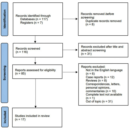 A total of 124 studies were identified via electronic research. A total of 116 studies were eligible after duplicate removal and screening based solely on title and abstract analyses. A total of 6 studies were written in languages other than English; 30 case reports, reviews, correspondences, personal opinions, or commentaries were removed; the complete text was not available in 1 study, while 31 were removed for focusing on different topics after applying inclusion and exclusion criteria. Therefore, a total of 17 studies were included in our review (Figure 1).