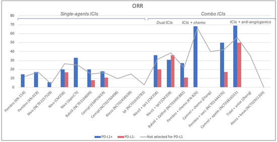 Overall response rate (ORR) of the included studies. ORR of the studies for patients not selected for Programmed Death Ligand 1 (PD-L1) status (gray line), PD-L1-positive patients (blue bar), and PD-L1-negative patients (red bar) are reported. In patients not selected for PD-L1, ORR ranged from 0% to 26.3% with single-agent ICIs, reaching 38.4% with dual ICIs association, 65.9% with the combination of ICIs and chemotherapy, 55.6% with ICIs plus tyrosine-kinase inhibitors (TKIs). In PD-L1-positive patients, ORR ranged from 5.9% to 33% with single-agent ICIs, from 27% to 36% with dual ICIs, reaching 68.1% and 69% when ICIs were combined with chemotherapy and TKIs, respectively. In PD-L1-negative women, ORR was 0–16.7% to single-agent ICIs, 11–35.8% to double ICIs, and reached 50% after ICIs + TKIs.