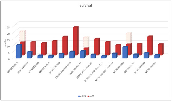 As already known in other tumor subtypes, ICIs impact survival in advanced CC patients, ranging from 8 to over 21 months, with most studies that have not reached the mOS yet.
