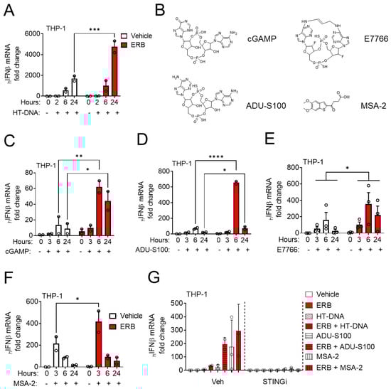 Eribulin enhances IFNβ expression initiated by STING agonists. (A) Human IFNβ mRNA in THP-1 cells transfected with 5 μg/mL HT-DNA and treated with 100 nM eribulin (ERB) or vehicle for 2, 6, or 24 h. (B) The chemical structure of the STING agonists examined in this study. Analysis of human IFNβ mRNA in THP-1 cells treated with (C) 10 μM cGAMP, (D) 10 μM ADU-S100, (E) 1 μM E7766 or (F) 33 μM MSA-2 with 100 nM ERB or vehicle for 3, 6 or 24 h. (G) Human IFNβ mRNA in THP-1 cells pretreated with 1 µM of the STING inhibitor H-151 for 4 h followed by transfection with 5 μg/mL HT-DNA or treatment with 10 μM ADU-S100 or 33 μM MSA-2 with or without 100 nM ERB. Statistical significance of eribulin as compared to control at each timepoint is shown as determined by a two-way ANOVA (time × eribulin) with Sidak’s posthoc test. * p < 0.05, ** p < 0.01, *** p < 0.001, **** p < 0.0001. For panel E, the main effect of eribulin is shown.