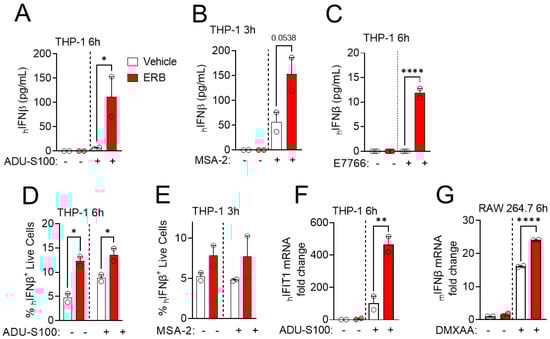 Eribulin stimulates the release of IFNβ and activates downstream interferon stimulated genes. Analysis of human IFNβ secreted from THP-1 cells treated with (A) 10 μM ADU-S100 with or without 100 nM eribulin (ERB) for 6 h, (B) 33 μM MSA-2 with or without 100 nM eribulin for 3 h, or (C) 1 μM E7766 with or without 100 nM eribulin for 6 h. Significance of eribulin on IFNβ secretion was determined by one-way ANOVA with Dunnett’s posthoc test comparing all conditions to the STING agonist alone. Analysis of intracellular human IFNβ protein in THP-1 cells treated with (D) 10 μM ADU-S100 with or without 100 nM eribulin for 6 h or (E) 33 μM MSA-2 with or without 100 nM eribulin for 3 h. Significance of eribulin on intracellular IFNβ levels was determined by two-way ANOVA with Sidak’s posthoc test. (F) Analysis of human IFIT1 mRNA in THP-1 cells treated with 10 μM ADU-S100 with or without 100 nM eribulin for 6 h. (G) Analysis of mouse IFNβ mRNA in RAW 264.7 cells treated with 35 μM DMXAA with or without 100 nM eribulin for 6 h. Statistical significance of eribulin on IFIT1 or IFNβ expression compared to STING agonist alone was determined by one-way ANOVA with Dunnett’s posthoc test, comparing all conditions to the combination.* p < 0.05, ** p < 0.01, **** p < 0.0001.