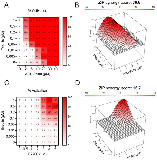 The ability of eribulin to promote a robust increase in IFNβ expression when combined with STING agonists invoked the hypothesis that this interaction was synergistic. To test this possibility, a series of concentrations of STING agonists (ADU-S100 or E7766) and eribulin were added to THP-1 cells as single agents or in combination, and the secretion of IFNβ was monitored by ELISA. Cell density was reduced as compared to previous ELISAs (Figure 2) in order to allow for detection of synergistic effects in the linear range of the assay, owing to differences in the relative potency of STING agonists for detectable IFNβ induction in these experiments. Consistent with our previous studies [6], the low induction of the STING pathway by eribulin alone did not yield any detectable increase in secreted IFNβ up to a concentration of 1 µM, but the addition of eribulin at concentrations as low as 5 nM was sufficient to increase IFNβ secretion induced by the STING ligands (Figure 3A,C). To determine if the effects of eribulin and STING agonists were synergistic, we utilized zero interaction potency (ZIP) analysis that combines the advantages of the Loewe and Bliss synergism models while reducing the false positive rate [39]. ZIP synergy analysis performed using SynergyFinder [30] found that the combination of eribulin with ADU-S100 yielded a synergy score of 36.6 and the combination of eribulin with E7766 yielded a synergy score of 16.7 (Figure 3B,D). These values demonstrate profound synergy between eribulin and pharmacological STING agonists for IFNβ production, surpassing the accepted synergism score thresholds of 5–10 reported in the literature [39,40]. Collectively, these findings demonstrate that the combination of eribulin with STING agonists leads to a synergistic increase in IFNβ secretion.