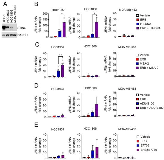 Eribulin enhances IFNβ expression induced by STING agonists in TNBC cells. (A) Immunoblot analysis of STING and GAPDH in THP-1 and TNBC cells. Human IFNβ mRNA in TNBC cell lines (HCC1937, HCC1806, or MDA-MB-453) each transfected with (B) 5 μg/mL HT-DNA or treated with (C) 33 μM MSA-2, (D) 10 μM ADU-S100 or (E) 1 µM E7766 with 100 nM eribulin (ERB) or vehicle. Statistical significance of eribulin with the STING agonist as compared to the STING agonist alone is shown as determined by one-way ANOVA with Dunnett’s posthoc test comparing all conditions to the combination. * p < 0.05, ** p < 0.01. The uncropped Western blots have been shown in Figure S4.