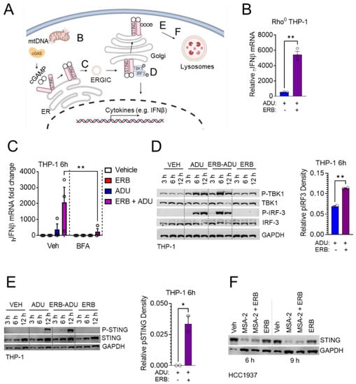 The STING-dependent induction of interferon signaling requires STING exit from the endoplasmic reticulum (ER). This can occur upon the binding of an endogenous or pharmacological ligand which induces a conformation change in STING that allows for trafficking through the secretory pathway [47]. After leaving the ER in response to ligand binding, STING recruits the kinase TBK1 which subsequently phosphorylates itself, STING, and the transcription factor IRF3 within the ER–Golgi intermediate compartment (ERGIC)/cis-Golgi before STING is degraded in the lysosome (Figure 6A) [48]. We have previously shown that eribulin as a single agent can activate STING-dependent IFNβ expression downstream of the release of mitochondrial DNA (mtDNA) into the cytoplasm [6]. However, this induction is much lower than endogenous or pharmacological STING ligands and is not sufficient to detect increased IFNβ secretion by ELISA. To interrogate whether the release of mtDNA by eribulin was necessary for enhancing the IFNβ response mediated by STING agonists, we grew THP-1 cells in ethidium bromide to deplete them of mitochondrial DNA (Rho0 THP-1) (Figure S3A). ADU-S100-induced interferon secretion was enhanced by eribulin in these Rho0 THP-1 cells, suggesting that the eribulin-mediated enhancement of STING agonist activity was distinct from its ability to promote mtDNA release into the cytoplasm (Figure 6B). This finding led us to empirically test other mechanisms by which eribulin could enhance the activity of STING ligands, including the regulated trafficking of STING from the ER, the phosphorylation of TBK1/IRF3/STING, and lysosomal degradation of STING. To test if the known disruption of intracellular organelles downstream of microtubule destabilization [49,50,51] could override controlled ER exit, we pre-treated THP-1 cells with brefeldin A (BFA) at a concentration that caused complete disruption of the cis-Golgi (Figure S3B), followed by treatment with the combination of eribulin and ADU-S100. BFA abrogated the induction of IFNβ expression by the STING agonist with or without eribulin, suggesting that eribulin was not overriding the regulated exit of STING from the ER in spite of destabilizer-induced organelle disruption [49,50,51] (Figure 6C). We next examined the phosphorylation of TBK1, IRF3 and STING over time after treating THP-1 cells with eribulin and ADU-S100 where we observed that eribulin promoted an increase in phosphorylated IRF3 and STING as compared to ADU-S100 alone, particularly at the 6 h timepoint when the effects on IFNβ expression are most pronounced (Figure 6D–E). Finally, we also tested the hypothesis that the organelle fragmentation caused by microtubule destabilizers [49,50,51] could enhance STING-dependent signaling by inhibiting its lysosomal trafficking and degradation. Similar to previous reports [52], we did not observe significant STING degradation in the THP-1 cells upon activation (Figure 6E and Figure S3C). However, in HCC1937 cells, where STING levels were effectively decreased by STING activation with MSA-2, eribulin did not inhibit this decrease (Figure 6F), suggesting that microtubule destabilization is not inhibiting STING degradation in the lysosome.