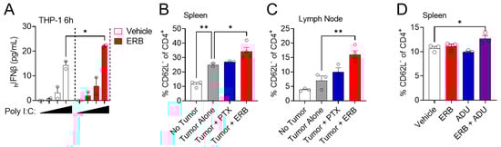 Eribulin enhances the response to multiple immune agonists, in vitro and in vivo. (A) Human IFNβ protein secreted from THP-1 cells treated for 6 h with or without 100 nM eribulin in the presence of 0, 1, 2, or 5 µg/mL poly(I:C). Significance of eribulin determined by two-way ANOVA with Sidak’s posthoc test. Frequency of CD62L− CD4+ T-cells in (B) the spleen or (C) the tumor draining lymph node of BALB/c female mice bearing 4T1 tumors compared to no tumor controls or tumored animals receiving 1 mg/kg eribulin Q7Dx2 or 20 mg/kg paclitaxel Q2Dx6 by i.p. injection. Significance determined by one-way ANOVA with Dunnett’s posthoc test comparing all conditions to the tumor alone group. n = 2–4 animals/group (D) Frequency of CD62L− CD4+ T-cells in the spleen of non-tumored FVB/NJ female mice treated with 0.7 mg/kg eribulin Q4Dx5 i.p., 50 µg ADU-S100 Q4Dx3 s.c., or a combination of the two drugs. n = 3 animals/group. Percentages of CD62L− CD4+ T-cells calculated from the total CD4+ T-cell population. Significance was determined by one-way ANOVA with Dunnett’s posthoc test, comparing all conditions to the vehicle control. * p < 0.05, ** p < 0.01.