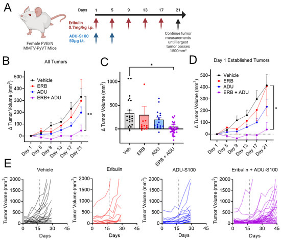 The combination of eribulin with a STING agonist provides anti-tumor efficacy in a transgenic mammary tumor model. (A) Timeline of the tumor trial. (B) Change in tumor volume of all tumors in each treatment group throughout the dosing period as average ± SEM. (C) Individual values for change in tumor volume on day 21. (D) Change in tumor volume of only tumors established on day 1 of the tumor trial as average ± SEM. Significance on day 21 shown as determined by mixed-effects analysis (B), one-way ANOVA (C), or two-way ANOVA (D) each with Tukey’s posthoc test. (E) Spider plots of individual tumor volumes are shown for each treatment group. ERB + ADU (n = 4 mice, 58 tumors), ERB (n = 2 mice, 20 tumors), ADU (n = 2 mice, 29 tumors), and vehicle (n = 2 mice, 28 tumors). Vertical dashed line denotes last day of dosing. * p < 0.05, ** p < 0.01.