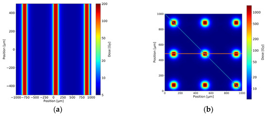 The dose distribution in the tissue and in the cell layer of the in vitro experiment (equivalent to 1 cm and 1 mm depth in water) was calculated using Monte Carlo simulations in the toolkit GEANT4 (version 10.4.2). The Livermore low energy physics libraries were used for these simulations, the range cut-offs for the electrons and photons were set to 1 µm. The simulations were performed in their semi-adjoint form [25] and the source model was adapted from [26]. The field sizes were 8.5 × 18 mm² for the small animal study (mouse) and 38 × 38 mm² for the in vitro experiment. The microbeams hit the water phantom of 40 mm thickness and the energy was scored at a mesh size of 1 × 1 × 0.005 mm (MBI) and 1 × 0.01 × 0.01 mm (PBI) with the highest resolution in the direction of the spatial fractionation. A total number of 109 photons were simulated following the ESRF preclinical spectrum [22]. The collimator leakage with a harder X-ray spectrum was also taken into account [26]. Figure 2 shows the simulated microbeam dose profile for the in vitro exposures in the MBI and PBI techniques.