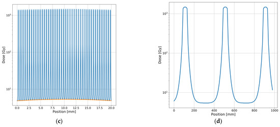 Results from the Monte Carlo simulation for MBI and PBI at a 1 mm depth in water (cell layer of in vitro exposures). Profiles of MBI with a peak dose of 174 Gy (a,b). Horizontal (c) and diagonal (d) profiles of PBI across the field @ 1500 Gy (compare Figure 1).