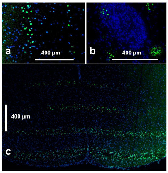 Immunohistochemistry: The formalin-fixed and in paraffin embedded brains were sectioned 5.0 µm thick and mounted on microscope slides (SuperFrost® Plus, R. Langenbrinck, Germany) for gamma H2AX immunostaining, as described previously [14]. Briefly, the tissue sections were deparaffinized and rehydrated by passing them through a series of alcohol and xylene washes, followed by vapour-based heat epitope retrieval in a citrate solution at pH6 (Target retrieval solution, Dako, Germany) at a temperature of 95 °C for 40 min. The tissue sections were then blocked with 100 μL of 1× PBS, 5% goat serum, and 0.3% triton X-100 buffer for 60 min at room temperature, followed by the incubation with gamma H2AX (Abcam 22551, Cambridge, UK), as the primary antibody at a dilution of 1:100 for 1 h at room temperature. Finally, the tissue sections were incubated with Alexa Fluor 488 at a dilution of 1:200 (Thermo Fisher Scientific, Waltham, MA, USA) as a secondary antibody and DAPI for 1 h at room temperature in the dark. Following the thorough rinsing with PBS, the slides were cover-slipped with Dako Fluorescent Mounting Medium (Dako North Amerika Inc., Carpinteria, CA, USA) and microphotographs were obtained using a fluorescence microscope (BZ-X, Keyence Deutschland GmbH, Neu-Isenburg, Germany) with a camera and computer link. For the immunofluorescence of the gamma H2AX stain, the excitation wavelength was 544 nm with an emission at 488 nm. The immunostaining utilizes antibodies against the histone 139, which is only accessible after DNA-double-strand-breaks, such as those developing after irradiation. We have shown previously that the gamma H2AX antibody with a DAPI nuclear counterstain is reliable for the assessment of the DNA damage after MRT [14].