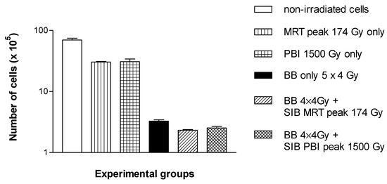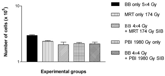 Similar to the results of the in vivo study, the results of the in vitro study also suggest that a spatially fractionated high dose rate SIB should be included into a low dose-rate schedule early rather than late. The cell proliferation assay conducted with cells receiving the high dose rate SIB on the last day of irradiation shows that cell death occurs continuously during the first 72 h after irradiation (Figure 4). While the number of non-irradiated control cells increases in this period, the number of irradiated cells decreases. While there is no significant difference between both of the high dose rate irradiation techniques, the difference between the low dose rate irradiation only and the low dose rate irradiation plus the high dose rate SIB is significant at 72 h after irradiation (p < 0.0001).