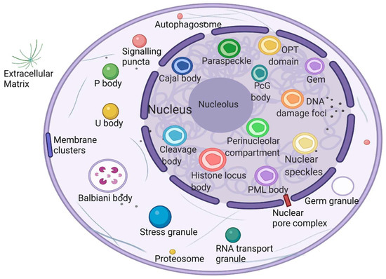 Biomolecular condensates located throughout the nucleus and cytoplasm. Created with BioRender.com.