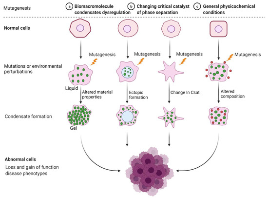Incorrect or abnormal phase separation of biological macromolecules is closely related to the occurrence of many types of diseases, such as cancer, neurodegenerative diseases, and infectious diseases [41,42,43]. The formation and regulation of aberrant biomolecular condensates is changing the way people think about coping with many diseases, including tumor genesis, diagnosis, and treatment. Researchers are no longer considering highly recurrent point mutations in tumors merely based on the structural visual field but are also considering the condensates involved in these mutations. Generally, combined with current existing research, there are three mechanisms of abnormal biological phase separation leading to disease: (a) The first mechanism is biomacromolecule condensate dysregulation. In cancer, IDR-related signal receptor mutations or chromosome translocations can promote the shape of signal clusters or condensates at transcription or DNA damage repair sites and then change the cell signal cascade, drive abnormal transcription programs or DNA damage repair, and promote cancer cell proliferation [44]. (b) The second mechanism is the changing of the critical catalysts required for phase separation. There is evidence that enzymes can regulate the assembly of biomolecular condensates through posttranslational modification (PTM). For example, DYRK3 is located in condensate and phosphorylates several serine and threonine residue groups in IDRs [45]. During stress recovery, inactivation and activation of DYRK3 are crucial to the formation and dissolution of SG [46]. (c) The third mechanism is the altering of general physicochemical conditions in cells. Cells exposed to stress undergo extreme fluctuations in the levels of ion concentration, osmotic conditions, and pH values, which can change the solubility and interactions of biological macromolecules, resulting in abnormal phase separation [47] (Figure 2).