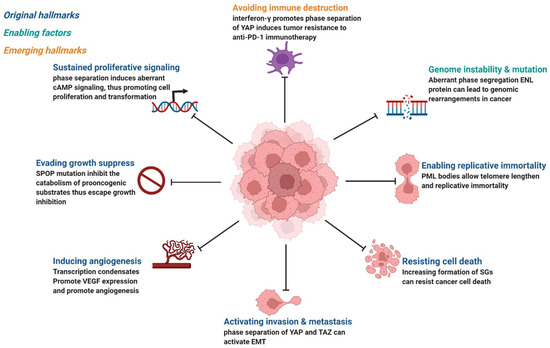 Phase separation abnormalities are involved in most of the processes known as cancer hallmarks. Created with BioRender.com.