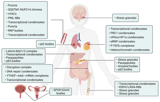 Cancer-related condensates in human cancers. Distribution of various types of cancer and related condensates in the human body. Created with BioRender.com.