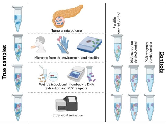 The pancreatic tumor microbiome has been investigated in multiple studies. Table 1 provides an overview on the pancreatic microbiota described by recent studies. Regarding the microbial signature in PDAC, most studies came up with a highly similar microbiota composition, especially on a higher taxonomic rank. The dominant taxon across most published microbial compositions in PDAC is the phylum Proteobacteria. This comprises Gammaproteobacteria including Enterobacteriaceae, commensal bacteria inhabiting the intestines, and Alphaproteobacteria. A plethora of environmental genera belong to the latter class: Rhizobium, a symbiont of legumes; Sphingopyxis, found in environmental niches such as water and soil; and Methylobacterium, a common contaminant of DNA extraction kit reagents [,]. Surprisingly, these three genera and many more environmental bacteria were often published as tumoral microbes (Table 1). This observation raises a major concern and pitfall of sequencing low microbial biomass samples: contamination. Contaminants are introduced during every step of the microbiome analysis workflow and potentially mask the true taxa in tumoral samples if not properly controlled for (Figure 1). Therefore, the RIDE checklist (Report–Include–Determine–Explore), a minimum standards checklist for low microbial biomass microbiome studies proposed by Eisenhofer et al., may guide all future microbiome studies. It stipulates to report methodology, include controls, determine the level of contamination, and explore the impact of contamination in downstream analyses []. The implication of negative controls is the most essential step for controlling for the contamination introduced in every part of the study process.