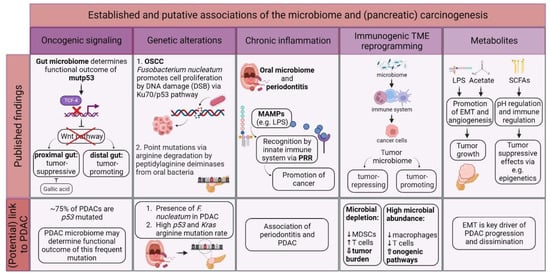Potential involvement of the microbiome in (pancreatic) oncogenesis. There is growing evidence on how different microbiomes contribute to carcinogenesis, e.g., via promoting oncogenic signaling, direct and indirect genetic alterations, chronic inflammation, and interaction with the immune system and secretion of microbe-derived metabolites. However, most of these theories have yet to be validated in PDAC patients. Tumor microenvironment (TME); mutant p53 (mutp53); pancreatic ductal adenocarcinoma (PDAC); oral squamous cell carcinoma (OSCC); desoxyribonucleic acid (DNA); double-strand break (DSB); microbe-associated molecular pattern (MAMP); lipopolysaccharide (LPS); pattern recognition receptor (PRR); myeloid-derived suppressor cell (MDSC); short-chain fatty acid (SCFA); epithelial-to-mesenchymal transition (EMT); and pondus hydrogenii (pH).