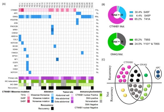 Genomic characteristics of desmoid tumors. (A) Landscape plot showing the alterations found by target-seq of 30 desmoid tumors. Each column represents a sample; each row represents a gene. Different colors indicate the type of genetic alteration, as shown at the bottom of the figure. (B) Pie charts for detailed mutation information of CTNNB1 and GNAQ. (C) Venn diagram displaying recurrence and major genetic alteration of the 30 cases patients. And, the dot represented the case.