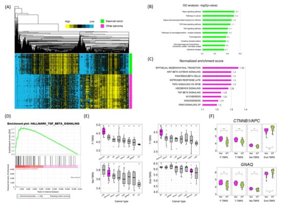 Gene expression profiles of desmoid tumors compared to other sarcomas. (A) Heatmap showing the results of hierarchical clustering. Rows represent patients; columns represent genes. The type of tumor is annotated at the right of the heatmap: green indicates desmoid tumors; magenta indicates other sarcomas. Expression levels are indicated in different colors, with yellow being high and blue being low. (B) Bar graph showing the results of GO and Kyoto encyclopedia of genes and genomes pathway analyses. (C) Bar graph showing the results of GSEA. Only the top ten pathways with nominal p values < 0.05 are shown. (D) GSEA plot of the TGF-β signaling pathway. (E) Boxplots showing F-TBRS, T-TBRS, Ma-TBRS and End-TBRS scores according to cancer type. Magenta boxes represent desmoid tumors; grey boxes represent other sarcomas. Cancer types with significantly different values (p < 0.05) compared with desmoid tumor are marked with asterisks (*).Each dot in the plots represent the value of each sample. (F) Violin plots showing TBRS scores according to CTNNB1/APC (n = 23 for Mut and n = 24 for WT) or GNAQ (n = 18 for Mut and n = 29 for WT) mutation status. Each dot in the plots represent the value of each sample. *** p < 0.001, ** p < 0.01, * p < 0.05; Wilcoxon rank-sum test. Abbreviations: FS, fibrous sarcoma; LMS, leiomyosarcoma; LPS, liposarcoma; MPNST, malignant peripheral nerve sheath tumor; Mut, mutated; SS, synovial sarcoma; USCS, undifferentiated spindle cell sarcoma; WT, wild type.