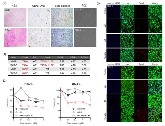 Preclinical model characteristics and anti-drug response. (A) H &E, SMA, and beta-catenin staining image of desmoid tissue (YD12 and YD23) and microscopic image of patient-derived preclinical models (YD12-C and YD23-C). (B) Most prevalent genetic alterations and TGFBR2, F-TBRS, and T-TBRS scores. YD12 had genetic alterations in CTNNB1 and GNAQ, while YD23 had CTNNB1 mutations. TGFBR2 and F-TBRS RNA expression were similar between YD12 and YD12-C. TGFBR2 expression was higher in YD23-C cells than in tumor tissue. F-TBRS levels were similar in YD23-C and YD23. T-TBRS levels were lower in both cell lines. (C) Cell viability with monotherapy (Vac; vactosertib, IM; imatinib) and combination treatment (Vactosertib (0.1 μM) and imatinib) in the patient-derived preclinical models. (D) Fluorescence microscopy image of the live-dead assay in the patient-derived preclinical models.