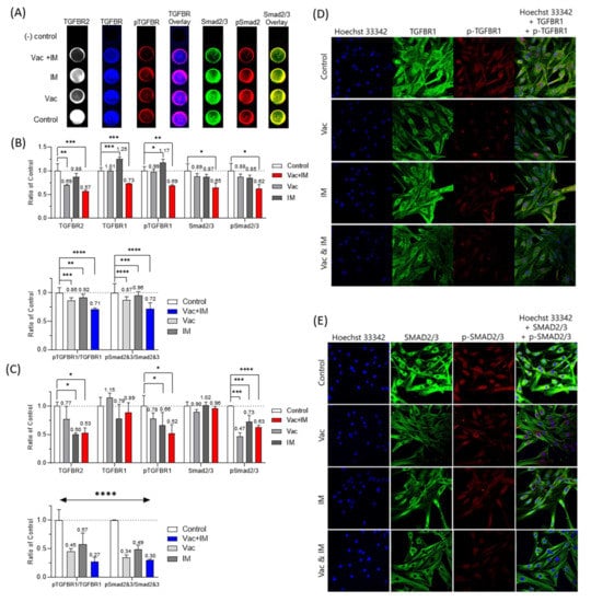 The cells were cultured in black, clear-bottom 96-well plates. After treatment with different drugs (Vac; vactosertib monotherapy, IM; imatinib monotherapy, and Vac + IM; combination of vactosertib and imatinib), the cells were fixed with 3.7% formaldehyde solution, washed with 1.0 % Triton X-100 solution in phosphate-buffered saline five times, and blocked using a blocking buffer (Li-COR). The fixed cells were then stained with primary and secondary antibodies using CellTagTM 700 Stain Kits and IRDye 800CW secondary antibodies (Li-COR) according to the manufacturer’s instructions.