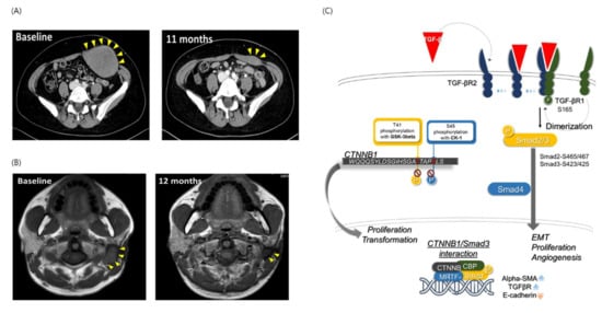 CT images of patients with desmoid tumors and schematic illustration of the interactions between the clinical and genomic properties of desmoid tumors. CT images from the ongoing clinical trial for the combination treatment (A,B). (C) Interaction between the clinical (beta-catenin and SMA expression) and genomic (CTNNB1 mutation and TGF-β signaling) properties of desmoid tumors.