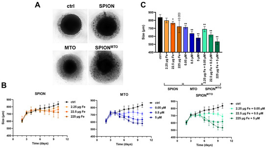 Analyzing the sizes of the spheroids over 10 days, we saw that the free MTO and its nanoparticle-bound counterpart SPIONMTO strongly reduced the growth of spheroids in an MTO dose-dependent manner. After 10 days, the untreated controls reached a size of approximately 840 nm, whereas treatment with 5 µM of MTO (free or nanoparticle-bound) resulted in spheroid sizes of approximately 600 and 580 nm, respectively. Although SPIONMTO resulted in smaller spheroids, the effect was not significant. Unloaded SPIONs also reduced the growth of spheroids, but to a lesser extent (Figure 2B,C): this may have been due to the formation of ROS caused by the iron surfaces [43].