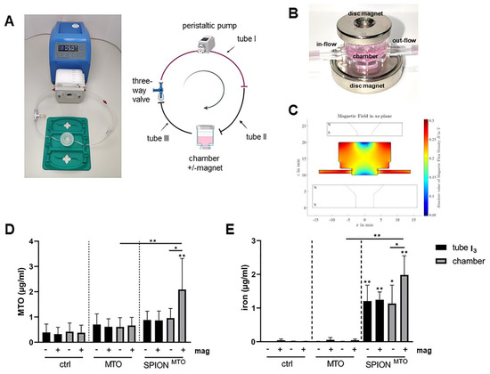 Ideally, in vitro experiments should be able to predict the in vivo outcome; thus far, we had analyzed the impact of free MTO, SPIONMTO and free SPIONs under static conditions. For the treatment of tumors in vivo, this setup was not appropriate, as the drugs were applied not in a static system, but in the blood, which was circulating in the body. To mimic blood flow and the tumor region, we applied a peristaltic pump connected with tubes to a chamber containing a tumor spheroid. MTO, SPIONMTO or SPIONs were applied in a bolus. To accumulate the SPIONs in the tumor region, magnets were placed around the chamber containing the spheroid (Figure 3A–C). Altogether, the pump was operated for 2.5–3 h, pumping medium through the system. To simulate the distribution of the applied drug out of the vessels into the tissues, the tubes with the containing medium were exchanged at three time points.