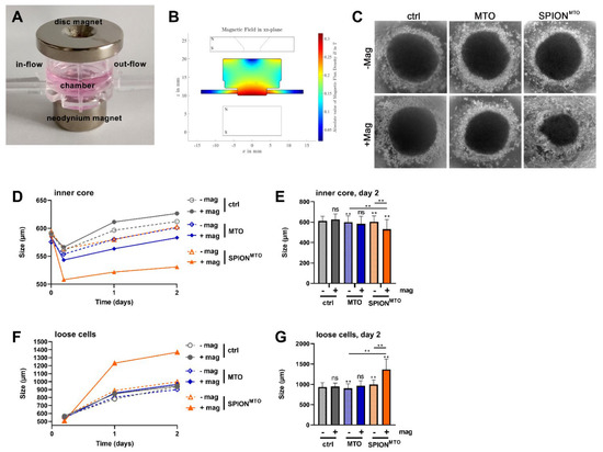 In order to address forces and conditions under blood flow in the human body, we performed experiments with magnetic nanoparticles ex vivo in human umbilical cord arteries [33,34]. For our first pilot experiments, targeting tumor spheroids under flow conditions, we immobilized colon carcinoma spheroids in channels melted into agarose, which were perfused with a peristaltic pump in the presence or absence of a magnetic field [17]. Although this approach enabled us to investigate the magnetic accumulation of nanoparticles under perfusion, only a few experiments were performed, due to the complicated production and recovery of the spheroids; therefore, we aimed to use a commercially available setup, consisting of transwell chambers carrying spheroids or organoids under flow conditions (MIVO®) [35]: in our opinion, the combination of both would be ideally suited to analyzing the magnetic accumulation and the effect of SPIONs or SPION-loaded cells in a standardized setup.