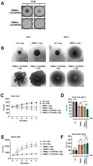 On the 3rd day after stimulation, the cells were counted again, using the MUSE Cell Analyzer. The pump system was built up, as stated before: 2.5 mL of RPMI medium was injected, as well as 0.5 mL of medium (control) or 0.5 mL of the PBMC solution containing 2.5 × 106 cells; six spheroids were added into each chamber. The flow was set up for 1 h in the presence or absence of the two magnets. The magnetic setup was the same as described in 2.10 (Figure 3A–C). Thereafter, all spheroids and the solution of one chamber were harvested in one well, and supplemented with 700 µL of RPMI medium. Then the spheroids were each embedded with 200 µL into a 96 round bottom well plate (Corning Incorporated, New York, NY, USA), and were observed for 5 days.