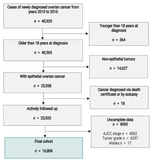 Data were obtained from the SEER database of the National Cancer Institute, the largest global open-access cancer database available, providing data from 18 population-based cancer registries covering about 28% of the total United States population [1]. The SEER database provides information about patient demographics, treatment methods, tumor characteristics, the follow-up period for survival analysis and sociodemographic data for the county of residence of the patients. We included all patients with epithelial ovarian cancer (serous, endometrioid, mucinous and clear cell) diagnosed between 1 January 2010 and 31 December 2016. Patients under the age of 18 years or diagnosed with ovarian cancer via their death certificate or at autopsy were not included. Patients with unknown American Joint Committee on Cancer (AJCC) stage or unknown tumor grade were also excluded. Finally, patients from Alaska were excluded due to the incomplete nature of sociodemographic data for this state. A flowchart of the study is provided in Figure 1.