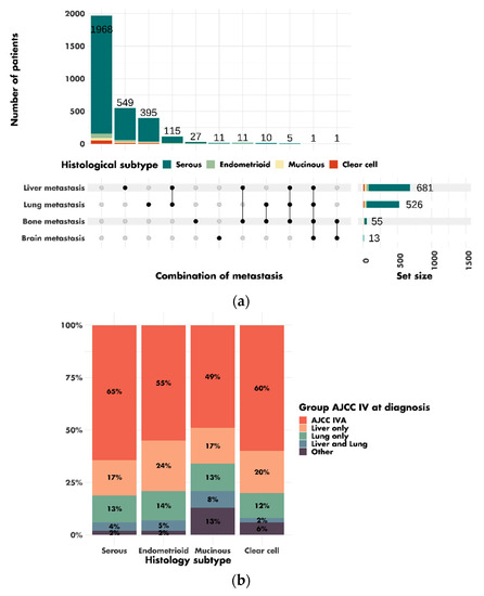 Combinations of metastases in patients with AJCC stage IV tumors at diagnosis: (a) description of the different combinations of metastases; (b) distribution of associations of metastases by histological subtype (p < 0.001).