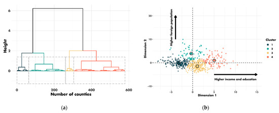 Clustering results: (a) cluster dendrogram; (b) distribution of county clusters according to the first two dimensions.