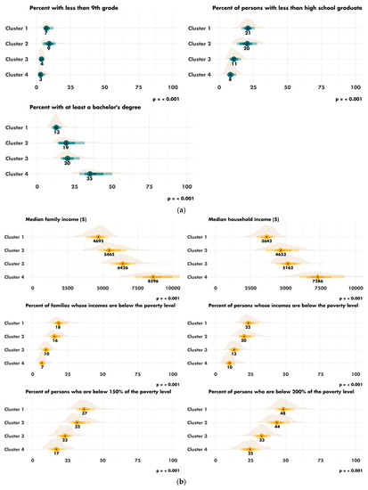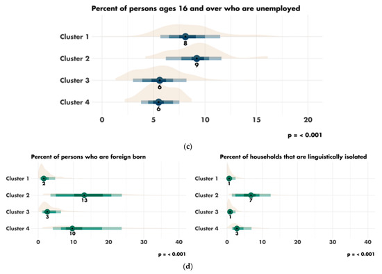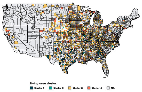 The characteristics of the four clusters related to education, income/poverty, employment, immigration and access to care are shown in Figure 4. The distribution of the variables related to demography, housing, smoking and mobility are presented in Figures S3–S6. The income and education level were lowest in cluster 1 (n = 225 counties), the counties of which had a low proportion of immigrants, were rather rural in nature and had low levels of access to healthcare. Cluster 2 (n = 67 counties) also corresponded to socially deprived areas, with low income and education levels, a high proportion of foreigners or immigrants and low levels of access to healthcare, but this cluster was more urban than cluster 1. Cluster 3 (n = 228 counties) corresponded to well-off areas with a high standard of living and high education levels, often rural, with a low proportion of immigrants and good access to healthcare. Finally, cluster 4 (n = 87 counties), like cluster 3, corresponded to well-off areas but mostly in urban settings and with a more diverse population. Access to healthcare was the greatest in cluster 4, in which 79.4% of the population had undergone a Pap smear test within the last three years, versus 72.4% in cluster 1 (p < 0.001). A map representing the distribution of the different clusters in the United States is shown in Figure 5.
