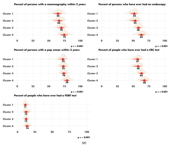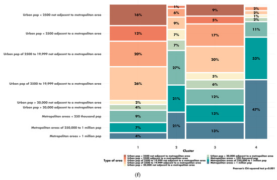 Characteristics of the clusters: (a) distribution of the variables related to education; (b) distribution of the variables related to income and poverty; (c) distribution of the variable related to employment; (d) distribution of the variables related to immigration; (e) disparity in access to care between the four clusters. Access to care is most difficult in cluster 1 and easiest in cluster 4. FOBT = Fecal Occult Blood Test. CRC = Colorectal Cancer Screening Blood Test. (f) Rural/urban distribution of the population in each cluster.