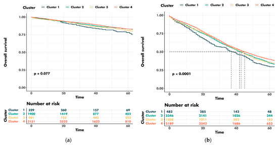 The five-year overall survival for the patients with early cancer was 78.0% for cluster 1 and 83.0% for cluster 4. The five-year overall survival rates for the patients with advanced-stage cancers were 29.5% for cluster 1 and 39.6% for cluster 4. The median overall survival for patients with AJCC stage III–IV tumors was 37 months for cluster 1 and 45 months for cluster 4. The median follow-up was 30.0 (range: 16.0–50.0) months.