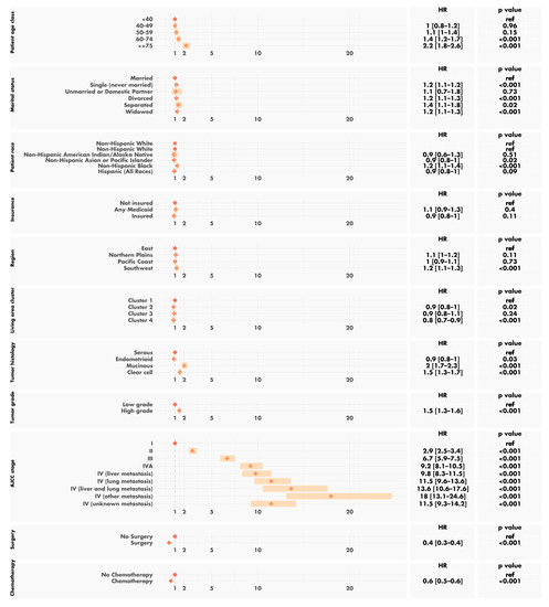 A multivariable survival analysis confirmed the known negative effects on the prognosis of older age, higher AJCC stage, particularly in cases of associated metastases, being black, having a mucinous or clear-cell tumor, high-grade tumors and, finally, a lack of surgery and/or chemotherapy (Figure 7). No interaction between the clusters and the other variables was found. After adjustment for other factors, the county cluster remained a statistically significant and independent predictor of overall survival. The patients from cluster 1 had a risk of death more than 25% higher than that for the patients from cluster 4 (HR 1.3, 95% CI 1.1 to 1.4, p < 0.001).