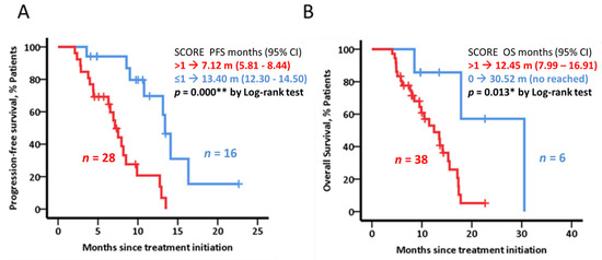 PFS and OS KM curves based on different cytokine score in BL patients (n = 44). (A) Kaplan–Meier plot represents PFS dichotomized depending on the points given by four cytokine levels, one point was given when cytokine levels were associated with worse PFS, 0 points (blue) between one and four (red). (B) The same as (A) for OS and dichotomized depending on the points given by four cytokine levels. In the text, PFS or OS and 95% CI values are shown. Log-rank test was used to test for statistical significance. * and ** in the figures indicate significant (p < 0.05) and very significant (p < 0.01) statistical differences.