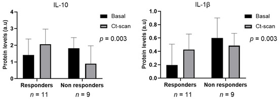IL1-10 and IL-1β dynamics in responders and non-responders. Cytokine levels are represented in 2 different time-points (basal: black; after CT assessment; grey). General lineal model was used to test for statistical significance and both demonstrated very significant (p < 0.01) statistical differences.