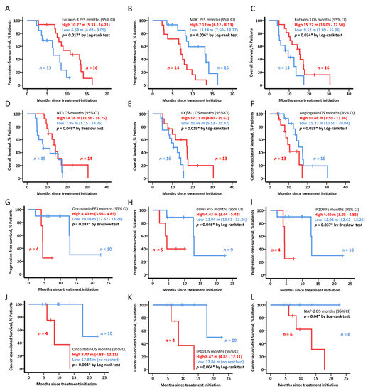 In the FOLFIRINOX receiving sub cohort patients with low levels of oncostatin, BDNF and IP10 reached significantly longer PFS (HR = 0.11; 95% CI: 0.11–1.08; p = 0.037, HR = 0.13; 95% CI: 0.14–1.34; p = 0.046, and HR = 0.11; 95% CI: 0.11–1.08; p = 0.037, respectively). Cancer-associated death time was significantly longer in subjects with low levels of oncostatin, IP10 or NAP-2 (HR = 0.003; 95% CI: 0–925; p = 0.004, HR = 0.003; 95% CI: 0–925; p = 0.004, and HR = 0.014; 95% CI: 0–45; p = 0.04, respectively) (Figure 3G–L).