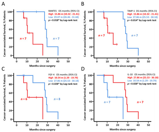 Cancer-associated death was significantly longer in subjects with low levels of RANTES, TIMP-1, and FGF-4 (p = 0.002, p = 0.014 and p = 0.028, respectively). In contrast, patients with high levels of IL-10 achieved longer OS (27.86 months vs. 10.54 months, p = 0.028) (Figure 4).