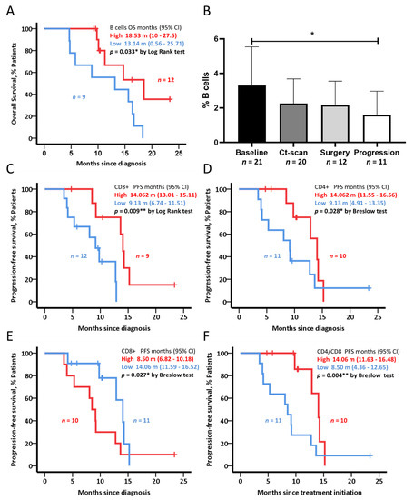 High baseline circulating B cells frequency was related to a significantly longer OS in the BL cohort of patients (p = 0.033) (Figure 5A). Importantly, B-cell population was significantly decreased in comparison with baseline samples (p = 0.044) when progression disease was confirmed (Figure 5B).