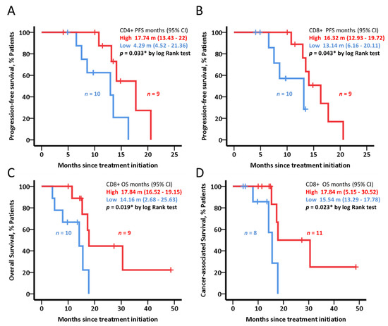Correlation of CD4 and CD8 T-cell populations in tumor tissue, with clinical outcomes in the BL cohort (n = 19). (A,B) Kaplan–Meier plots for PFS, (C) for OS, and (D) for cancer-associated death. * in the figures indicate significant (p < 0.05).