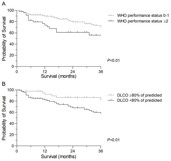 Kaplan–Meier survival curves for patients with non-small cell lung cancer who underwent surgery or stereotactic ablative radiotherapy. (A). Kaplan–Meier survival curve according to pretreatment World Health Organization (WHO) performance status (Log rank: p < 0.01). (B). Kaplan–Meier survival curve according to pretreatment diffusing capacity for carbon monoxide (DLCO) (Log rank: p < 0.01).