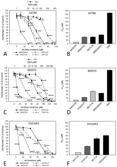 For the assessment of drug-mediated modulation of the expression of gene families and pathways, RNA-seq analyses of whole transcriptomes of A2780 and SKOV3 cells at 4 h and 48 h of drug treatment were performed. Data were analyzed using GO term enrichment and KEGG pathway analysis. As demonstrated in Supplementary Figures S6 and S7, the used inhibitory drugs exerted specific effects on pathways that regulate intracellular cell stress, cell death, cell division, and lipid metabolism in A2780 and SKOV3 cells after acute (4 h) and long-term (48 h) treatment. Overall, NAV2729, HTS01037, and SB-FI-26 affected a greater number of pathways than BMS309403 and SSO.